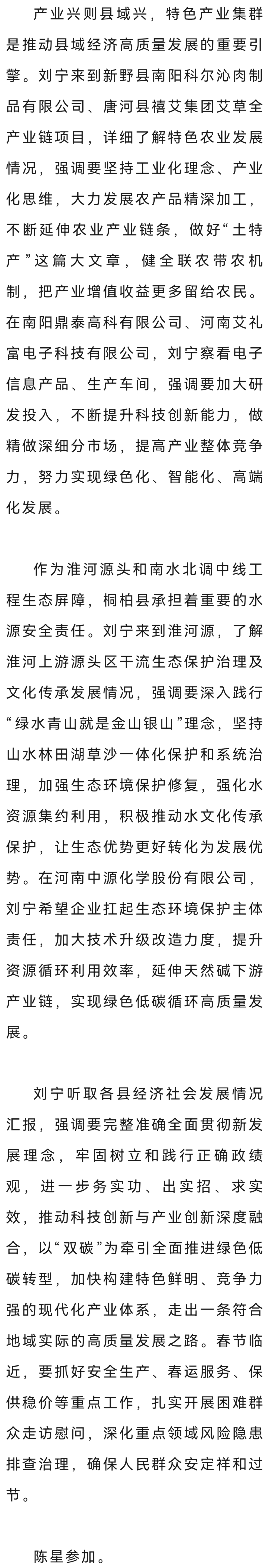 刘宁到南阳市新野唐河桐柏调研推动工作时强调 抓好粮食生产 培育特色产业 扎实推进县域经济高质量发展